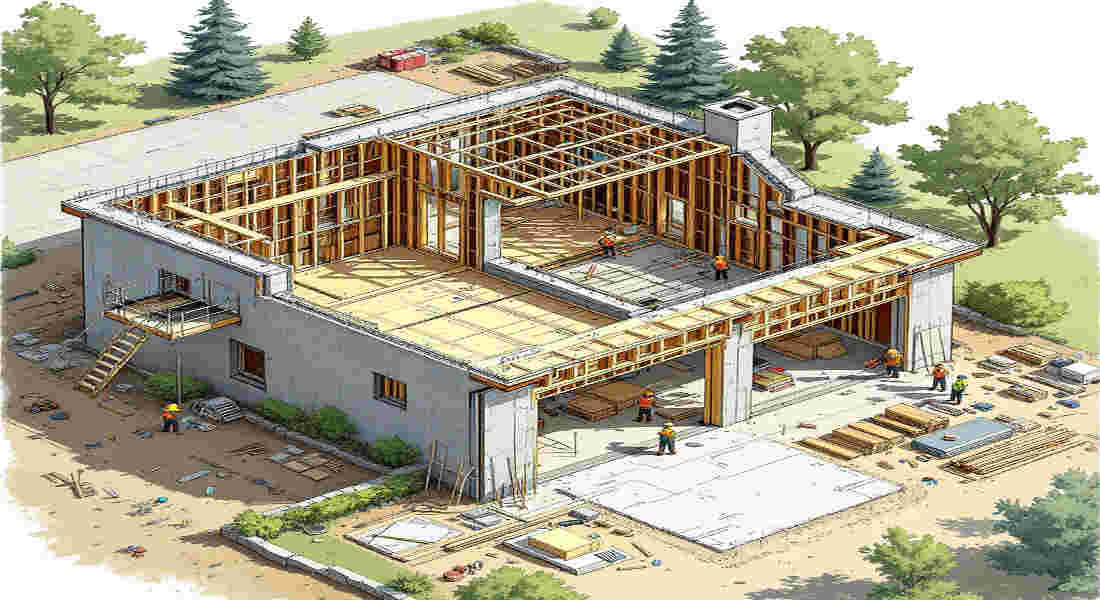 Sheathing (plywood or OSB) is nailed to the exterior of the wall frames. This step adds structural strength and prepares the walls for siding.